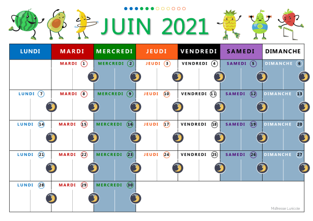 Autre version : Calendrier du mois de juin avec école le mercredi