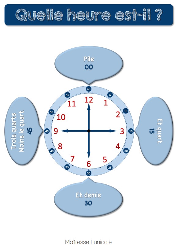 - Heures du matin (piles, et quart, et demie, trois quarts, moins le quart)
