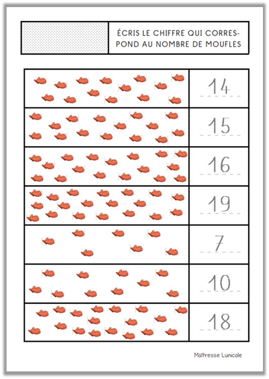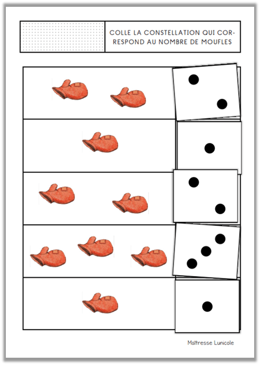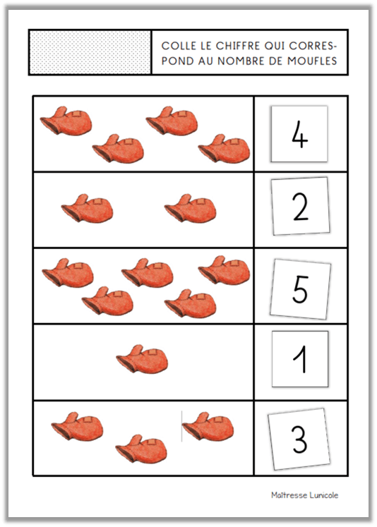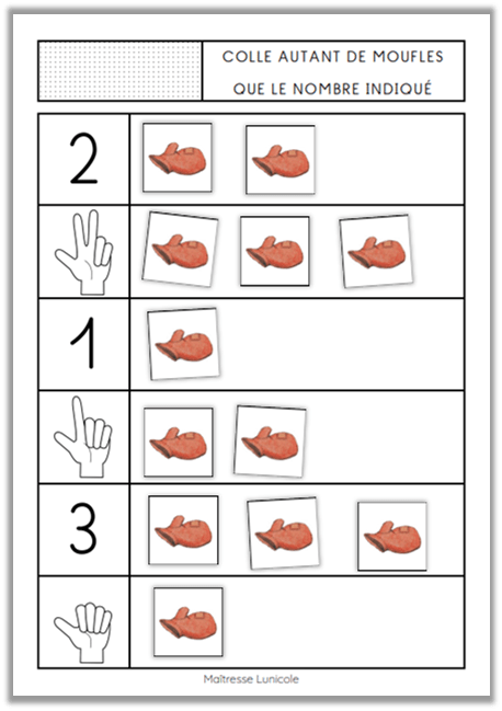 1. Fiche : Colle autant de moufles que le nombre indiqué