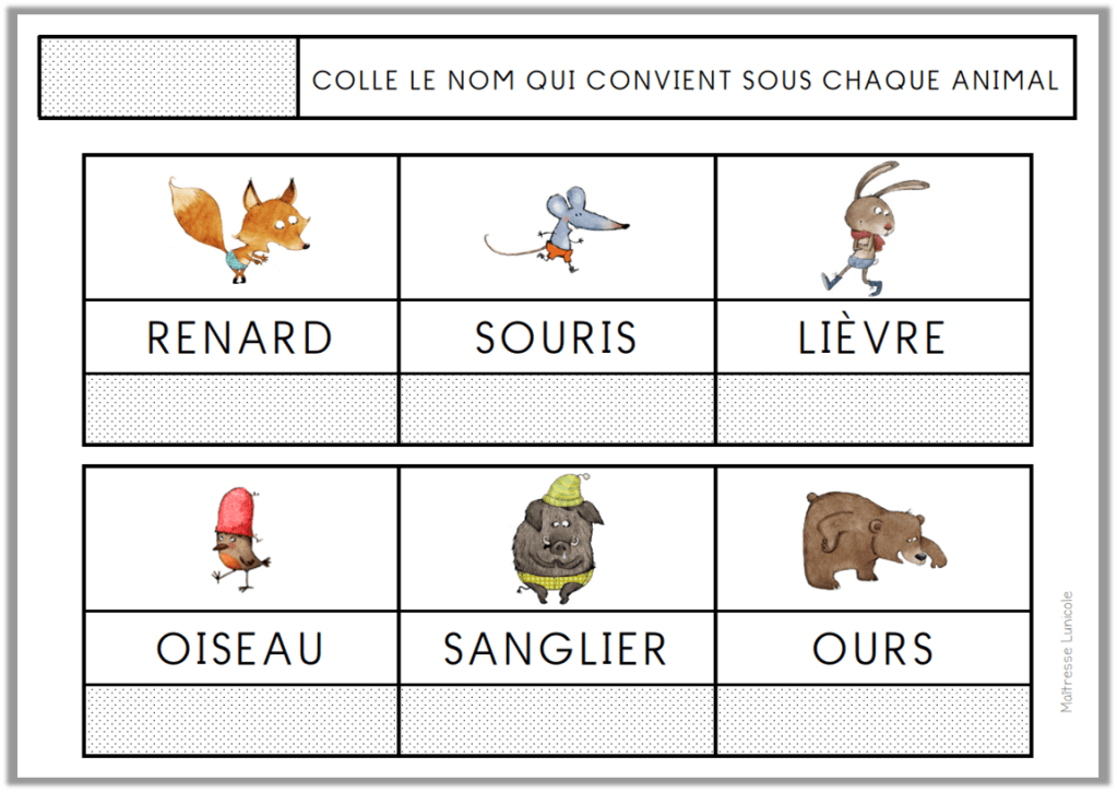 1. Fiche : Colle le nom qui convient sous chaque animal