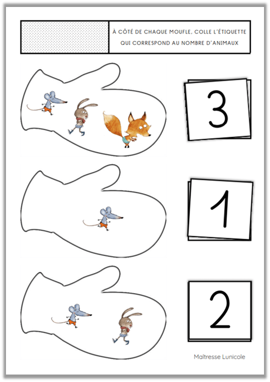 Fiche : Colle l’étiquette qui correspond au nombre d’animaux dans chaque moufle (de 1 à 3)