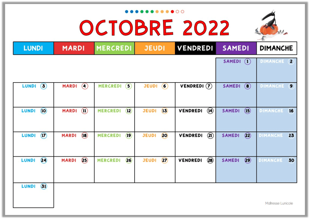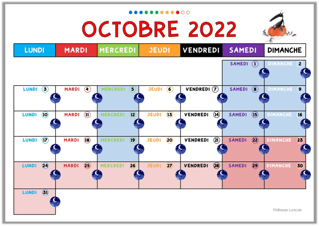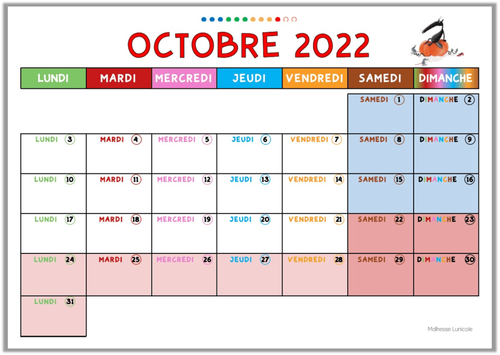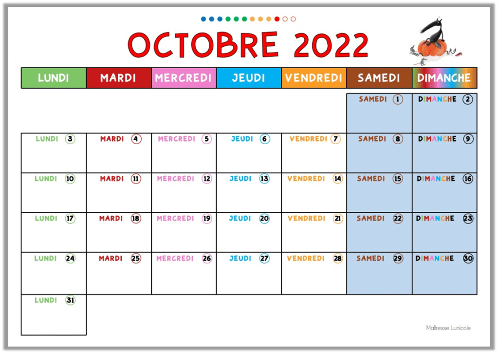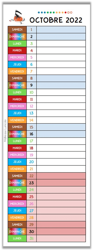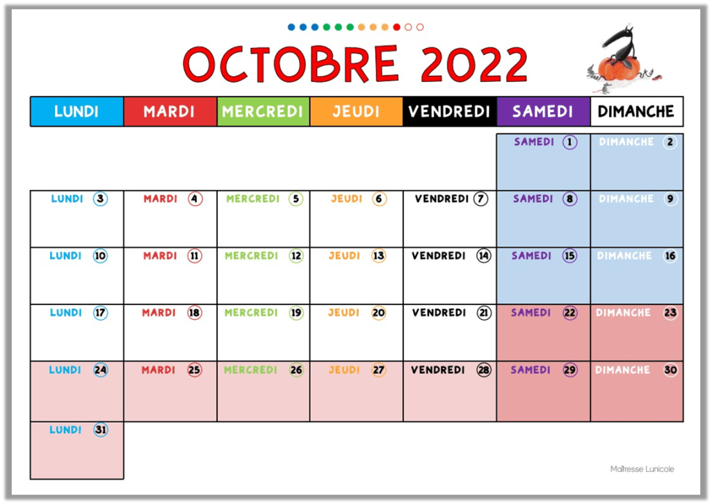 - Calendriers en tableau aux couleurs de la comptine (sans dodos)