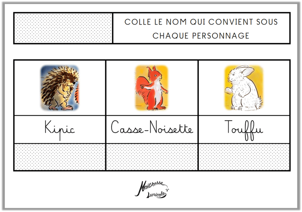 Colle le nom qui convient sous chaque personnage (capitales, scriptes, cursives)