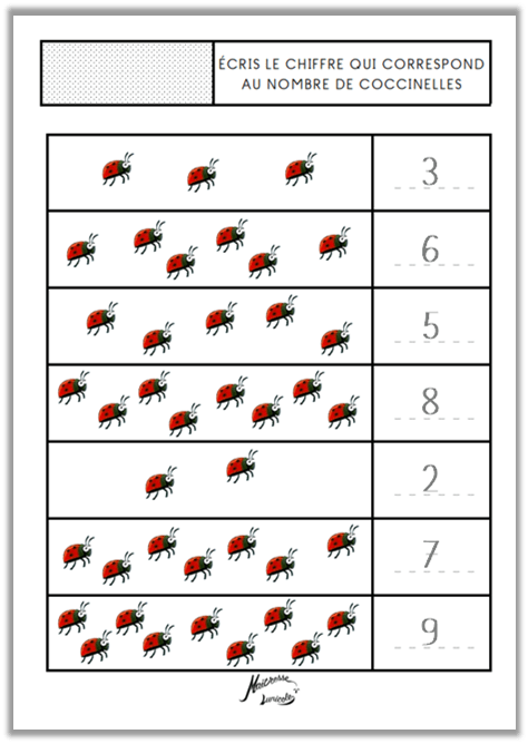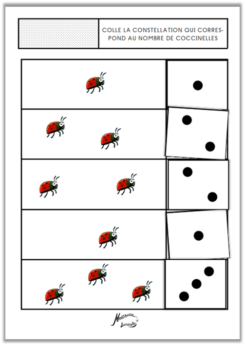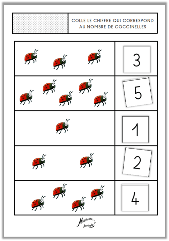 - Colle le chiffre qui correspond au nombre de coccinelles (1 à 2, 1 à 3, 1 à 4, 1 à 5, 1 à 9)