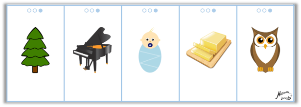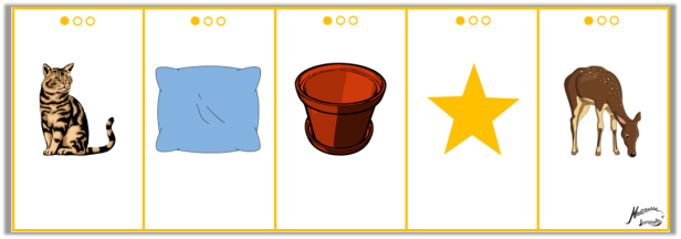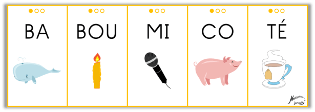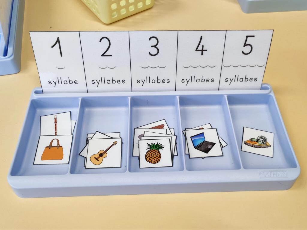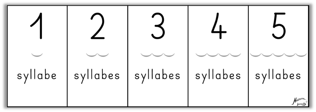 À chaque fois que nous commençons à travailler sur un nouveau thème ou sur un nouvel album, les élèves doivent trier les cartes du vocabulaire du thème ou de l’album travaillé en fonction du nombre de syllabes. En plus de s’entraîner à compter les syllabes, ils apprennent et retiennent le vocabulaire travaillé, même les mots un peu plus difficiles !