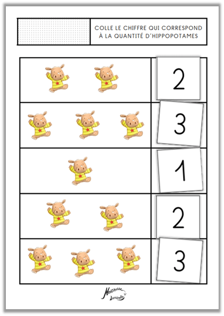 4. Colle le chiffre qui correspond à la quantité d’hippopotames (1 à 2, 1 à 3, 1 à 4, 1 à 5, 1 à 9)