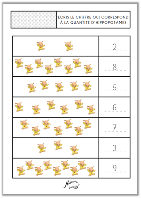 5. Écris le chiffre qui correspond à la quantité d’hippopotames (1 à 9, 1 à 19)
