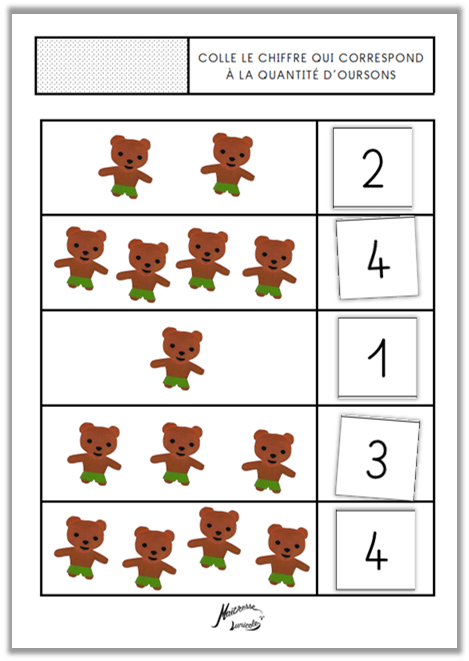 - Colle le chiffre qui correspond à la quantité d’oursons (1 à 2, 1 à 3, 1 à 4, 1 à 5, 1 à 9)