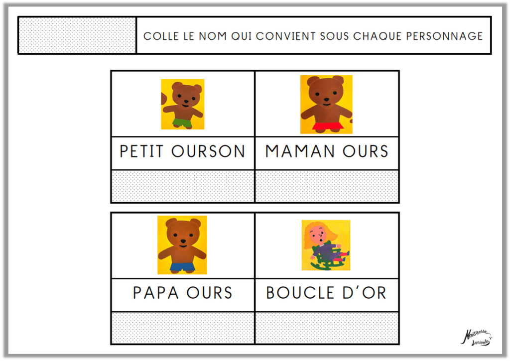 4. Colle le nom qui convient sous chaque personnage (capitales, scriptes ou cursives)