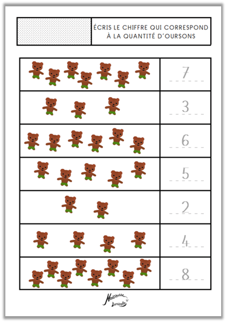 - Écris le chiffre qui correspond à la quantité d’oursons (1 à 9, 1 à 19)
