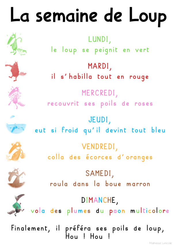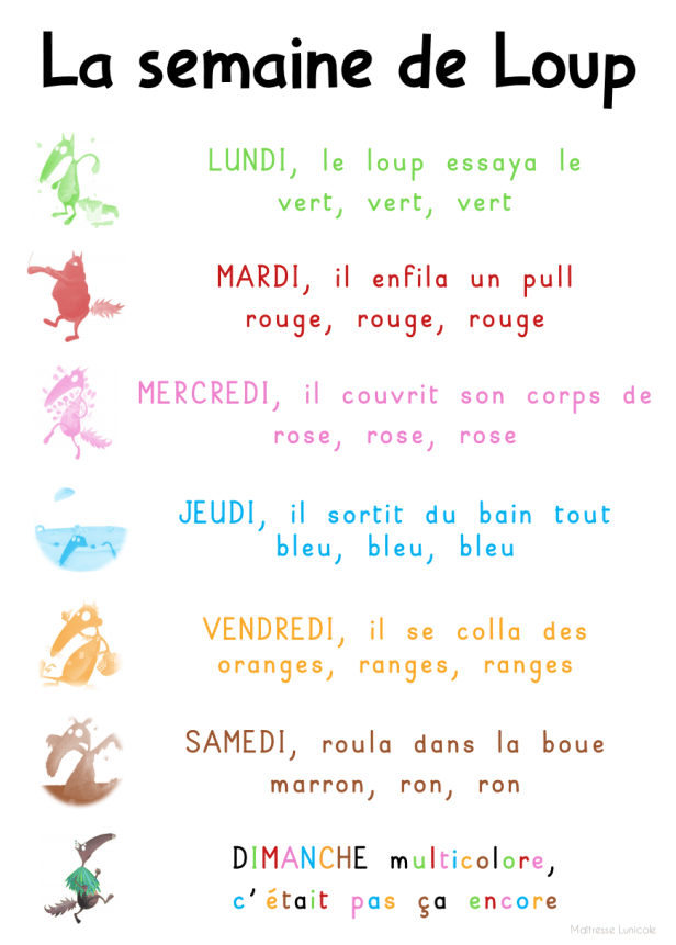 Dans ce nouvel article, je vais regrouper des supports que je proposais dans différents articles et en ajouter de nouveaux, tous liés aux jours de la semaine aux couleurs du Loup qui voulait changer de couleur (d’Oriane Lallemand et Éléonore Thuillier, aux éditions Auzou).