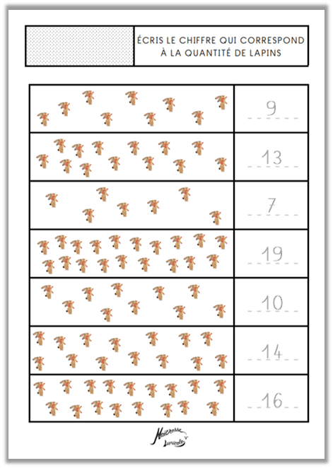 • Écris le chiffre qui correspond à la quantité de lapins (1 à 9, 1 à 19)