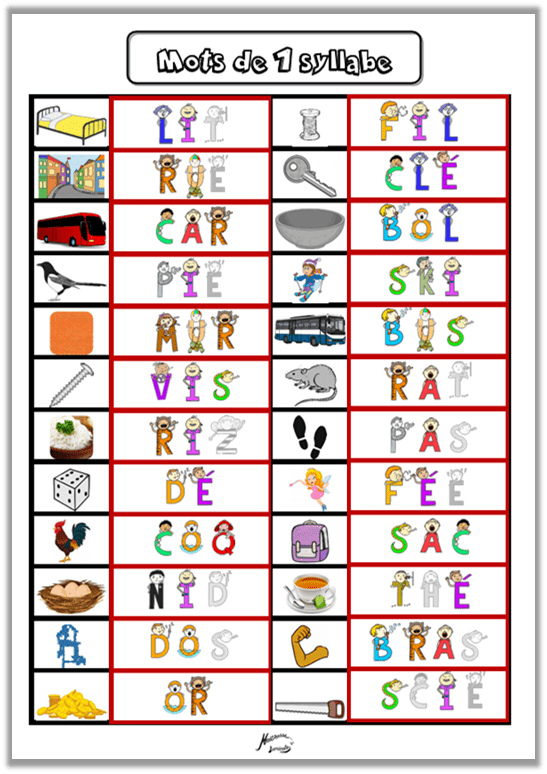 - Planches d’assemblage de mots simples (1, 2 ou 2 syllabes)