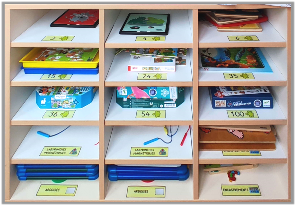 Merci pour l’idée, je vais réfléchir à la possibilité de modifier mon organisation de puzzles !! je les mettais déjà par nombre de pièces et difficultés, mais sans que ce soit explicite. Je mettais « simplement » la photo du puzzle sur l’étagère pour savoir où le ranger. J’envisage de rajouter le nombre de pièces. J’avais un meuble pour les PS et un pour les MS, mais finalement j’ai des PS super doués en puzzle, et de MS un peu moins, donc ce classement me permettrait davantage de flexibilité pour mes élèves. Merci pour l’idée et les étiquettes !!
