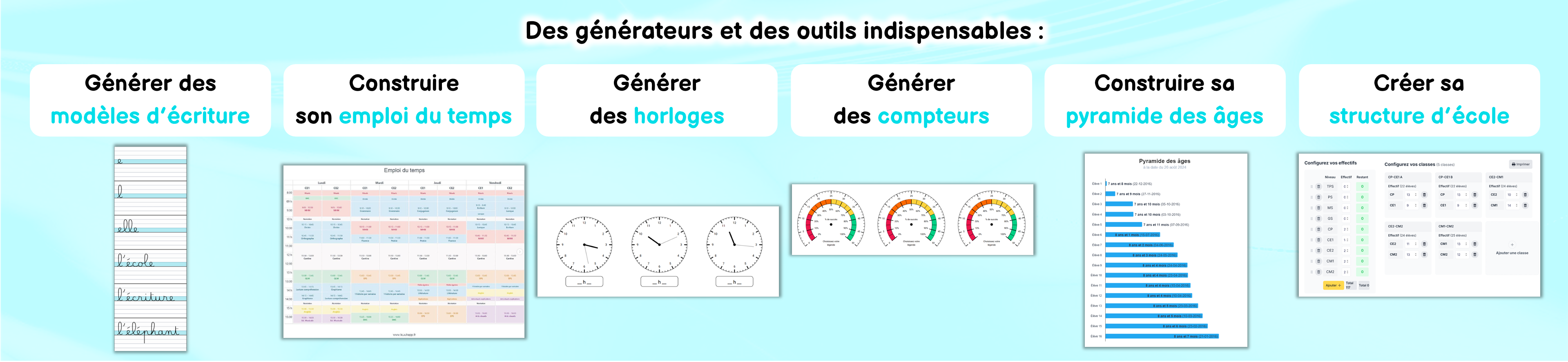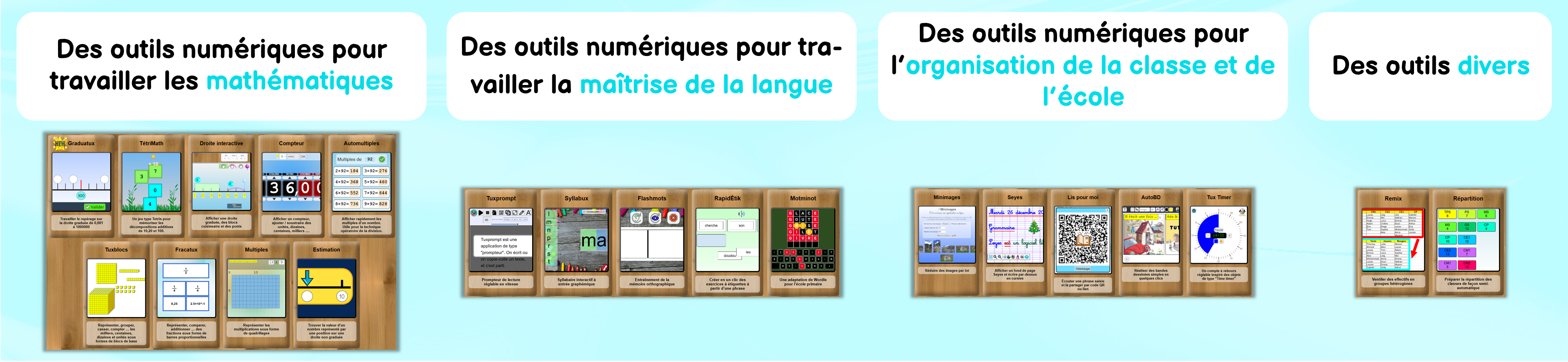 Une collection d’outils permettant de vous aider pour gérer votre classe, vos préparations, vos livrets, votre matériel pédagogique…