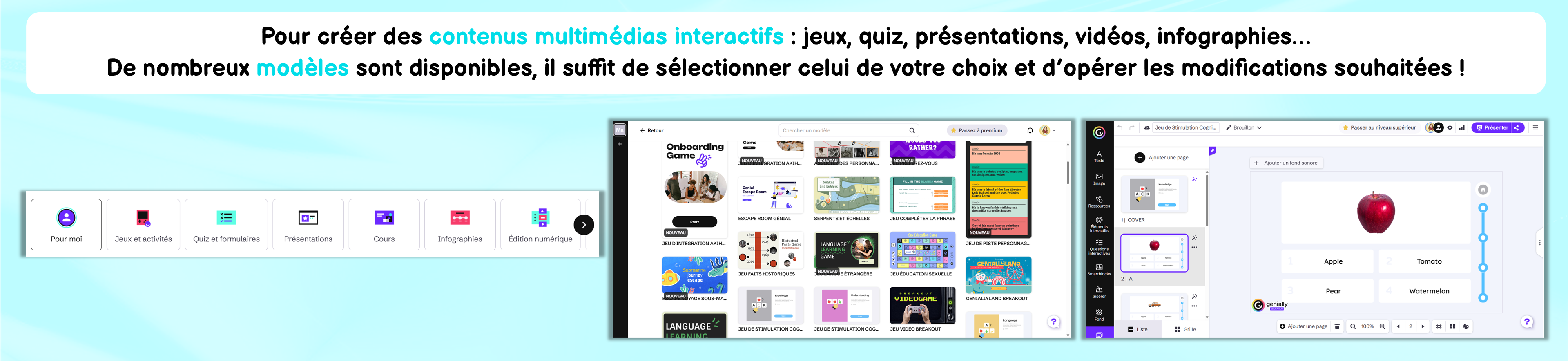 Un site qui vous permet de créer des contenus multimédias interactifs : jeux, quiz, présentations, vidéos… Des nombreux modèles sont disponibles également !