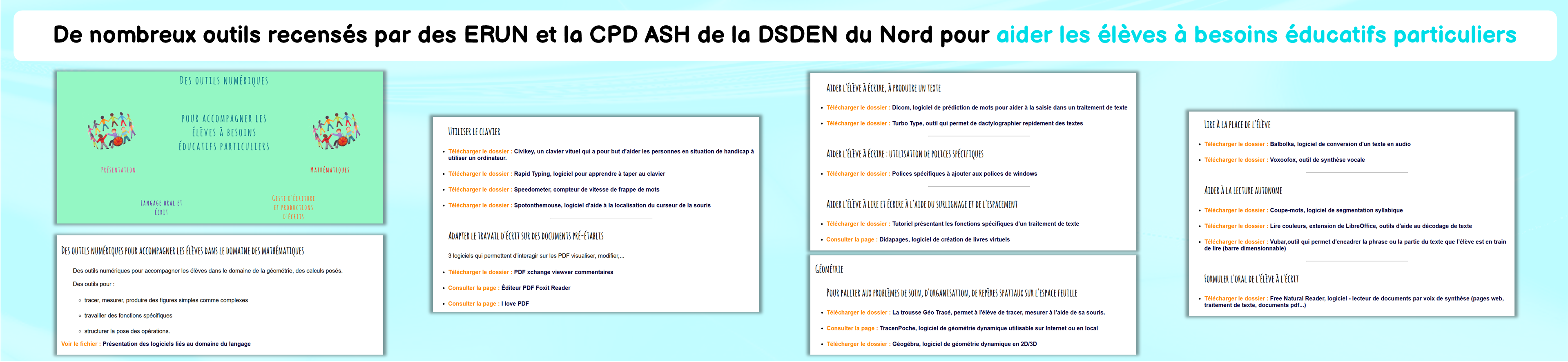 Des outils permettant de faciliter les apprentissages des élèves à besoins éducatifs particuliers, recensés par les ERUN et la CPD ASH de la DSDEN du Nord :