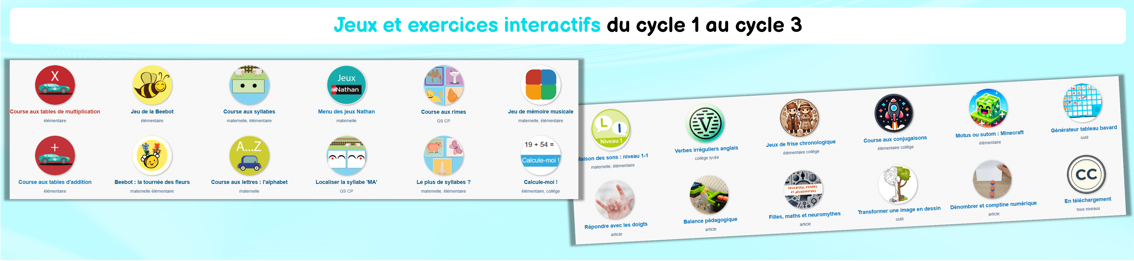 Une banque de jeux et exercices interactifs du cycle 1 au cycle 3, créés par un enseignant :