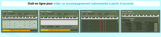 Vous ne trouvez pas de piste instrumentale pour accompagner vos élèves sur une chanson travaillée ? Avec cet outil, il vous suffit d’indiquer les accords de la chanson (que vous pouvez trouver en ligne ou sur des applications comme « Tabs »), de paramétrer votre accompagnement en choisissant parmi une sélection d’instruments, de mélodies, de tempos, puis l’outil va jouer en boucle l’accompagnement que vous aurez configuré. Vous avez également la possibilité d’exporter le fichier (format MIDI ou WAV) pour n’avoir plus qu’à ouvrir la piste exportée les fois suivantes, sans avoir à recréer l’accompagnement :