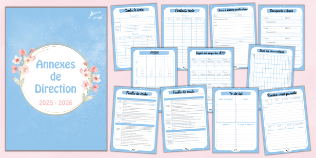 | → Page de garde → Contacts école → Élèves à besoins particuliers (action à mettre en œuvre, suivi…) → Enseignants et classes → ATSEM (classes, horaires et jours de présence, jours de cantine…) → Emploi du temps des AESH → Suivi des élèves notifiés (tableau à double entrée avec noms des élèves, noms des AESH, suivi des heures d’accompagnement de chaque élève et suivi des heures de présence de chaque AESH) → Feuille de route au fil de l’année (d’après le film annuel des directeurs d’école d’EDUSCOL) : 5 pages → To-do list (format matrice d’Eisenhower) : petit format → To-do list (format matrice d’Eisenhower) : grand format → 1 page « URGENT ET IMPORTANT », 1 page « URGENT », 1 page « IMPORTANT » et 1 page « NI URGENT NI IMPORTANT → Rendez-vous parents (à imprimer autant de fois que nécessaire) |