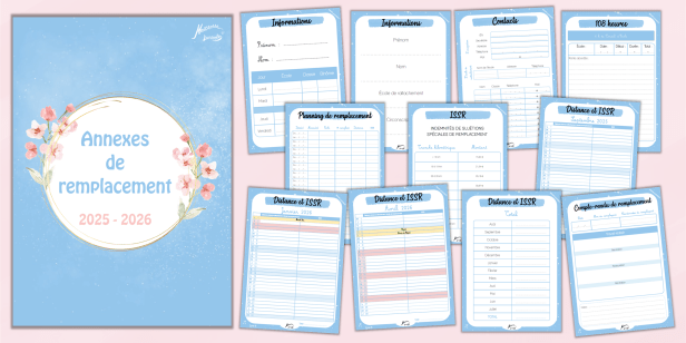 | → Page de garde → Au choix : Informations (TRS) OU Informations (ZIL / brigade) → Contacts → 108 heures (spécial remplacement) → Planning de remplacement (6 pages, à imprimer autant de fois que nécessaire) → ISSR : Indemnités de sujétions spéciales de remplacement (montants selon les tranches kilométriques) → Calendrier permettant de calculer les ISSR (un mois par page) → Total des ISSR à l’année → Compte-rendu de remplacement (à imprimer autant de fois que nécessaire) Annexes disponibles en 5 versions : → zone A, zone B, zone C, Réunion, vierge |