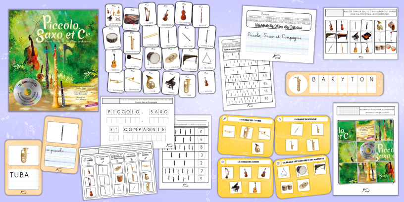 Voici une nouvelle exploitation pédagogique : celle du superbe conte musical Piccolo, Saxo et compagnie, d’André Pop, Jean Broussolle et Fred Multier. C’est ce conte pédagogique, sorti en 1956, qui m’a permis de découvrir une grande variété d’instruments de musique, leur son et leur famille alors que je n’étais qu’en maternelle (j’ai encore la cassette audio que ma grand-mère m’avait offerte !). Je songeais depuis longtemps à réaliser cette exploitation, elle m’a pris beaucoup de temps car c’était un gros chantier (surtout la partie impliquant de trouver une photo vectorielle libre de droit pour chacun des 31 instruments : clarinette, clarinette basse, trombone, trompette, tuba, cor, cor anglais, piccolo, basson, saxophone alto, saxophone ténor, saxophone baryton, saxophone soprano et j’en passe… il m’aura fallu 3 jours de travail mais au moins, je pense être incollable maintenant 😂).