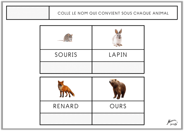 Colle le nom qui convient sous chaque animal (capitales, scriptes, cursives)