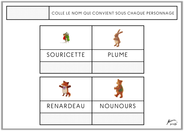 Colle le nom qui convient sous chaque personnage (capitales, scriptes, cursives)
