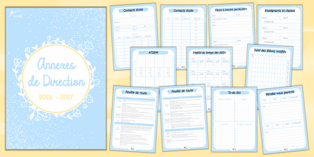 | → Page de garde → Contacts école → Élèves à besoins particuliers (action à mettre en œuvre, suivi…) → Enseignants et classes → ATSEM (classes, horaires et jours de présence, jours de cantine…) → Emploi du temps des AESH → Suivi des élèves notifiés (tableau à double entrée avec noms des élèves, noms des AESH, suivi des heures d’accompagnement de chaque élève et suivi des heures de présence de chaque AESH) → Feuille de route au fil de l’année (d’après le film annuel des directeurs d’école d’EDUSCOL) : 5 pages → To-do list (format matrice d’Eisenhower) : petit format → To-do list (format matrice d’Eisenhower) : grand format → 1 page « URGENT ET IMPORTANT », 1 page « URGENT », 1 page « IMPORTANT » et 1 page « NI URGENT NI IMPORTANT → Rendez-vous parents (à imprimer autant de fois que nécessaire) |