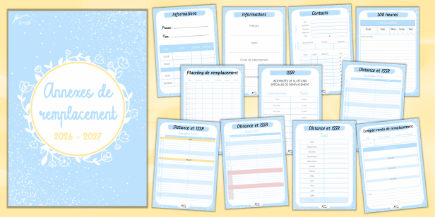 | → Page de garde → Au choix : Informations (TRS) OU Informations (ZIL / brigade) → Contacts → 108 heures (spécial remplacement) → Planning de remplacement (6 pages, à imprimer autant de fois que nécessaire) → ISSR : Indemnités de sujétions spéciales de remplacement (montants selon les tranches kilométriques) → Calendrier permettant de calculer les ISSR (un mois par page) → Total des ISSR à l’année → Compte-rendu de remplacement (à imprimer autant de fois que nécessaire) Annexes disponibles en 5 versions : → zone A, zone B, zone C, Réunion, vierge |