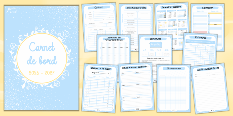| Comme d’habitude, je vous montre ma propre façon de le présenter, dans un classeur, avec les feuilles dans des pochettes afin que je puisse les réagencer et en rajouter autant je le souhaite au fil de l’année. Je reçois chaque année des photos de collègues qui ont imprimé et relié les documents afin d’en faire un vrai cahier, ce qui est très pratique également ! À vous de choisir la présentation qui vous convient 😃 |